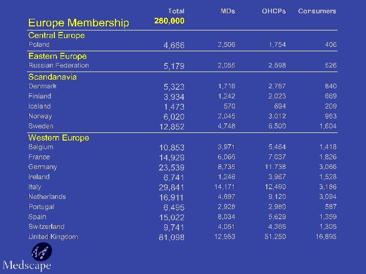 Globally. . . 2, 500 Non-US Members Join Every Day Western Europe: 280, 000 44. 5% Latin America: 100, 000 45% Africa: 22, 700 49% Asia (incl. India): 126, 000 38% Oceania: 77, 000 45% Source: Medscape Registration Database Current Membership as of 8/07/00 and % increase from 01/00