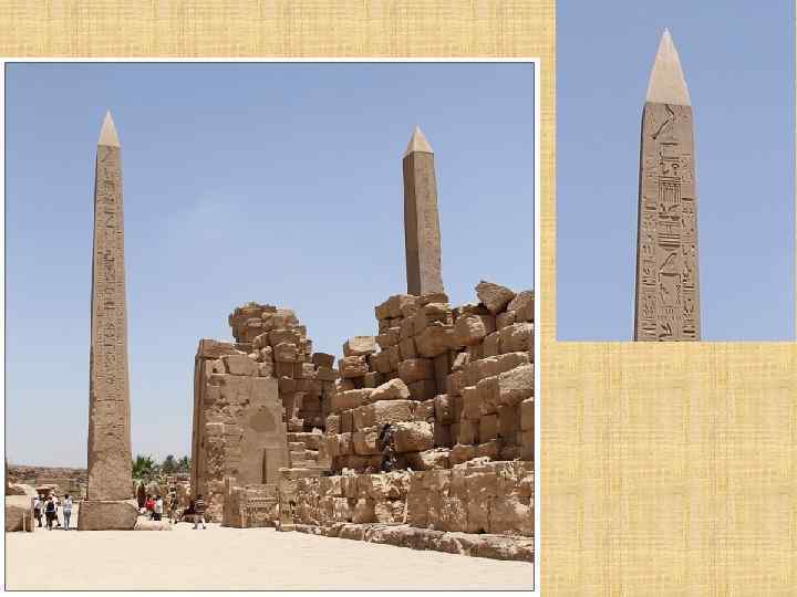Считается, что первые обелиски появились во времена V династии фараонов, правившей около 2504– 2347 гг. до н. э. Все уцелевшие обелиски вытесаны из цельного куска розового или красного гранита. Они имеют квадратную или прямоугольную форму столпа, сужающегося к верху и заканчивающегося так называемым пирамидионом. Пирамидион и расходящиеся от него вниз стилизованные солнечные лучи покрывались золотом или электрумом (сплав золота и серебра). На все четыре стороны наносились надписи в честь бога солнца и прославляющие фараона, по приказу которого и был изготовлен обелиск. Устанавливались обелиски в основном попарно около пилонов храма, либо у входа в гробницу.