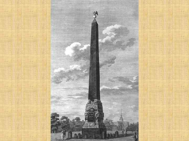 Стилизованный под древнеегипетский обелиск появился в Санкт-Петербурге в самом конце XVIII в. в память генерал-фельдмаршала графа П. А. Румянцева-Задунайского. Идея создать памятник в честь побед русских войск в Русско-турецкой войне, возникла у императрицы Екатерины II в 1795 г. Павел I своим указом выделил средства на сооружение монумента спустя несколько лет после смерти Румянцева. Задунайского.