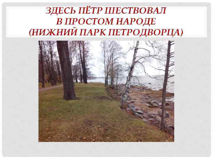 ЗДЕСЬ ПЁТР ШЕСТВОВАЛ В ПРОСТОМ НАРОДЕ (НИЖНИЙ ПАРК ПЕТРОДВОРЦА)