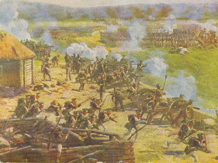 l В Бородинском сражении Багратион командовал левым крылом; туда Наполеон направил свои основные силы. Багратион и французские маршалы несколько раз отбивали друг у друга покрытые трупами людей и лошадей Семеновские флеши.
