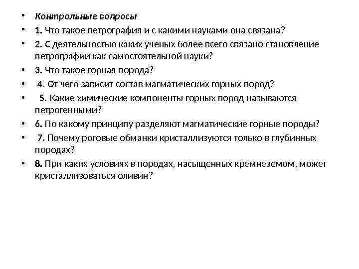 • Контрольные вопросы • 1. Что такое петрография и с какими науками она связана? • 2. С деятельностью каких ученых более всего связано становление петрографии как самостоятельной науки? • 3. Что такое горная порода? • 4. От чего зависит состав магматических горных пород? • 5. Какие химические компоненты горных пород называются петрогенными? • 6. По какому принципу разделяют магматические горные породы? • 7. Почему роговые обманки кристаллизуются только в глубинных породах? • 8. При каких условиях в породах, насыщенных кремнеземом, может кристаллизоваться оливин?
