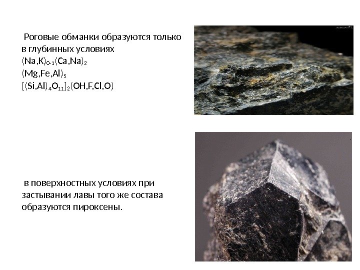 Роговые обманки образуются только в глубинных условиях (Na, K) 0 -1 (Ca, Na) 2 (Mg, Fe, Al) 5 [(Si, Al) 4 O 11 ] 2 (OH, F, Cl, O) в поверхностных условиях при застывании лавы того же состава образуются пироксены.