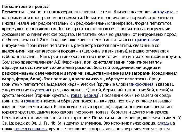 Пегматитовый процесс Пегматиты — крупно- и гигантозернистые жильные тела, близкие по составу интрузиям , с которыми они пространственно связаны. Пегматиты отличаются формой, строением и, иногда, наличием редкометальных и редкоземельных минералов. Форма пегматитов преимущественно жильная. Тесная пространственная связь пегматитов с интрузиями доказывает их генетическое родство. Пегматиты обычно удалены от интрузивных пород не более, чем на 1 -2 км. Подавляющее число пегматитов связано с гранитными интрузиями (гранитные пегматиты), реже встречаются пегматиты, связанные со щелочными магматическими породами (щелочные пегматиты), и редко отмечаются габбро-пегматиты. Минеральный состав пегматитов тот же, что и в материнской интрузии. Согласно представлениям А. Е. Ферсмана, при кристаллизации гранитной магмы образуется остаточный силикатный расплав, богатый соединениями редких и редкоземельных элементов и летучими веществами-минерализаторами (соединения хлора, фтора, бора). Этот расплав, кристаллизуясь, образует пегматиты. Среди гранитных пегматитов выделяют керамические (крупные блоки микроклина и кварца ), слюдоносные ( мусковит ), редкометальные (литий, бериллий, тантал-ниобий, цезий) и хрусталеносные (горный хрусталь, топаз , берилл ). Последние обычно залегают среди гранитов и гранито -гнейсов и образуют полости — камеры, поэтому их также называют камерными пегматитами. В этих полостях (занорышах) вырастают крупные кристаллы горного хрусталя, дымчатого кварца, мориона , топаза, берилла и других минералов. Пегматиты часто имеют зональное строение. Пегматиты — источник редкоземельных: Sc, Y, Ce, La; редких: Ве, Li, Ta, Nb, Sr и других элементов. Это источник пьезокварца , слюды , а также полевых шпатов , крупные скопления которых являются керамическим сырьем.