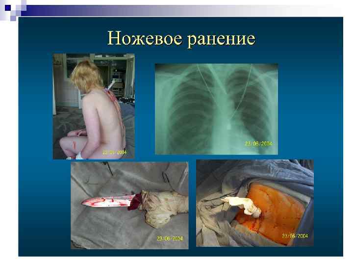 Открытые повреждения груди Ножевые ранения (колото-резаные раны) n Огнестрельные повреждения n ¨ по этиологии - пулевые, осколочные, минновзрывные ¨ по характеру раневого канала – слепые, сквозные, касательные ¨ по отношению к полостям – проникающие и непроникающие ¨ по отношению к внутренним органам – с повреждением и без повреждений органов ¨ к костям – с переломами или без переломов
