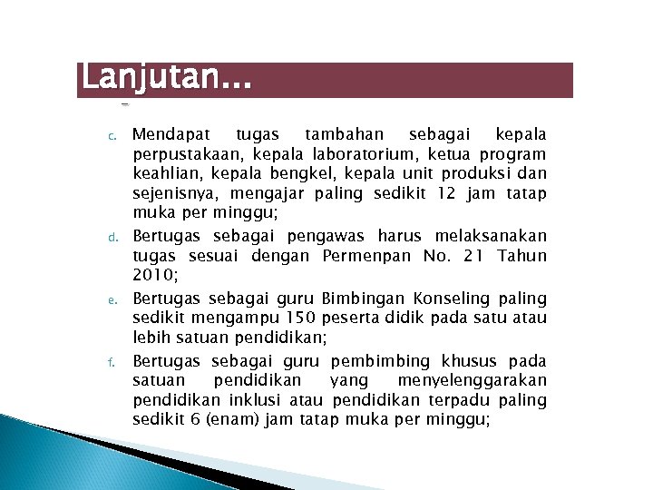 Lanjutan. . . c. d. e. f. Mendapat tugas tambahan sebagai kepala perpustakaan, kepala laboratorium, ketua program keahlian, kepala bengkel, kepala unit produksi dan sejenisnya, mengajar paling sedikit 12 jam tatap muka per minggu; Bertugas sebagai pengawas harus melaksanakan tugas sesuai dengan Permenpan No. 21 Tahun 2010; Bertugas sebagai guru Bimbingan Konseling paling sedikit mengampu 150 peserta didik pada satu atau lebih satuan pendidikan; Bertugas sebagai guru pembimbing khusus pada satuan pendidikan yang menyelenggarakan pendidikan inklusi atau pendidikan terpadu paling sedikit 6 (enam) jam tatap muka per minggu;