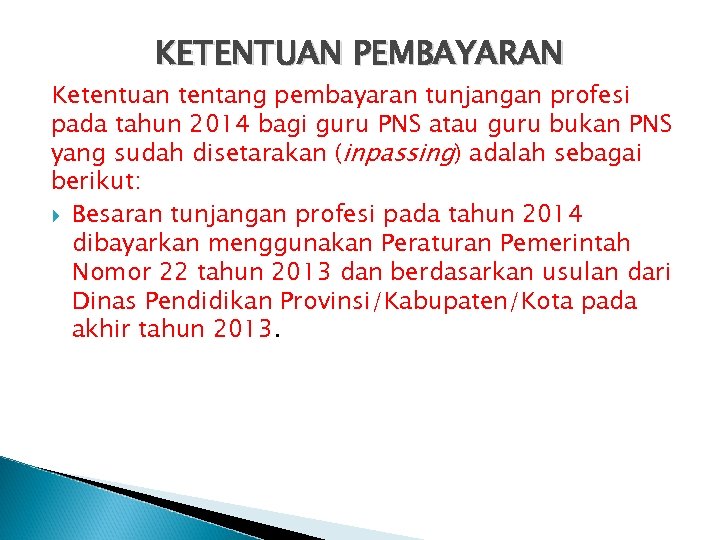 KETENTUAN PEMBAYARAN Ketentuan tentang pembayaran tunjangan profesi pada tahun 2014 bagi guru PNS atau guru bukan PNS yang sudah disetarakan (inpassing) adalah sebagai berikut: Besaran tunjangan profesi pada tahun 2014 dibayarkan menggunakan Peraturan Pemerintah Nomor 22 tahun 2013 dan berdasarkan usulan dari Dinas Pendidikan Provinsi/Kabupaten/Kota pada akhir tahun 2013.