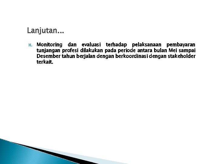 Lanjutan. . . H. Monitoring dan evaluasi terhadap pelaksanaan pembayaran tunjangan profesi dilakukan pada periode antara bulan Mei sampai Desember tahun berjalan dengan berkoordinasi dengan stakeholder terkait.