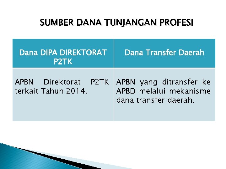 SUMBER DANA TUNJANGAN PROFESI Dana DIPA DIREKTORAT P 2 TK Dana Transfer Daerah APBN Direktorat P 2 TK APBN yang ditransfer ke terkait Tahun 2014. APBD melalui mekanisme dana transfer daerah.