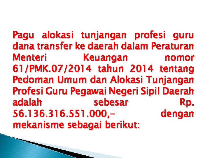 Pagu alokasi tunjangan profesi guru dana transfer ke daerah dalam Peraturan Menteri Keuangan nomor 61/PMK. 07/2014 tahun 2014 tentang Pedoman Umum dan Alokasi Tunjangan Profesi Guru Pegawai Negeri Sipil Daerah adalah sebesar Rp. 56. 136. 316. 551. 000, dengan mekanisme sebagai berikut: