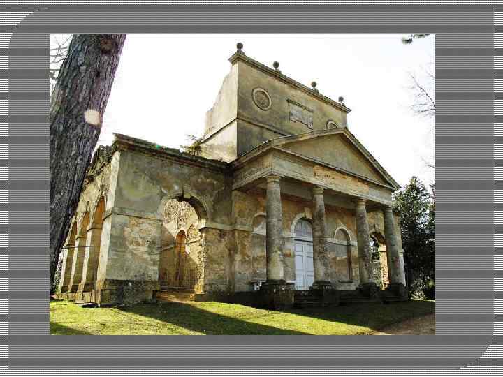 Парк насичений спорудами в дусі романтизму ( їх було близько 30: храми Бахуса , Дружби , Венери , Грот з каменю , Грот з раковин і т. д. ) , стилістично пов'язаними з архітектурою палацу і які є композиційними вузлами і акцентами паркових картин. Зміна пейзажів побудована різноманітно : на ритмічному наростанні враження або поступовому розгортанні картин , або на варіаціях якогось сюжету. Відкриті простори створені у вигляді обширних лугів з окремими групами , іноді невеликих галявин або витягнутих у вигляді променів.