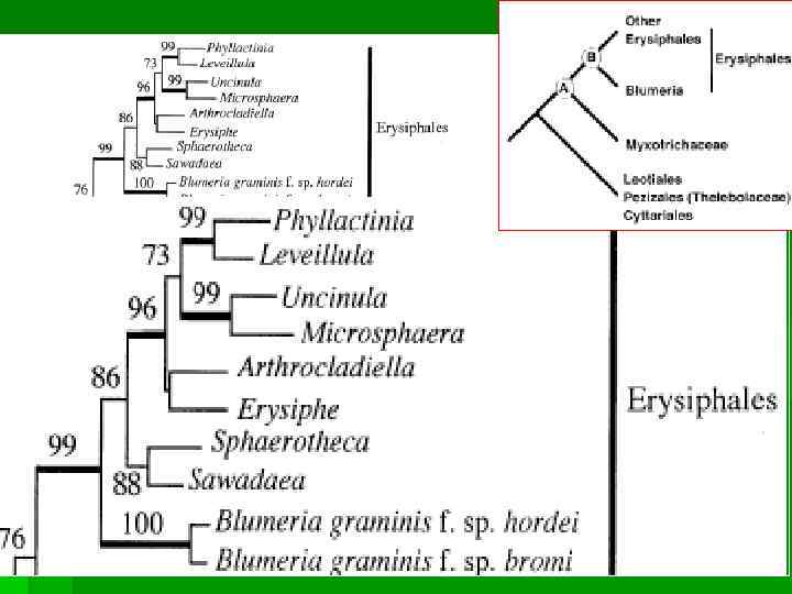 Blumeria § B. graminis— единственный вид, паразитирующий на злаках § Придатки мицелиальные § Пальчатые гаустории § Несколько сумок в аскокарпе § Конидиеносцы утолщенные в основании