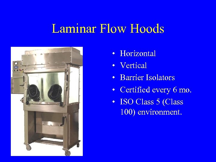 Laminar Flow Hoods • • • Horizontal Vertical Barrier Isolators Certified every 6 mo. ISO Class 5 (Class 100) environment.