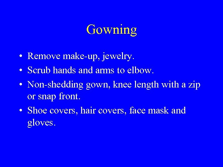 Gowning • Remove make-up, jewelry. • Scrub hands and arms to elbow. • Non-shedding gown, knee length with a zip or snap front. • Shoe covers, hair covers, face mask and gloves.
