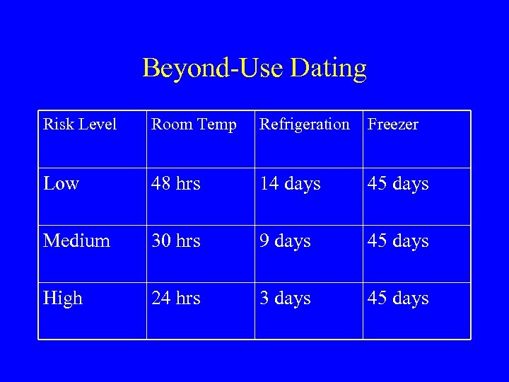 Beyond-Use Dating Risk Level Room Temp Refrigeration Freezer Low 48 hrs 14 days 45 days Medium 30 hrs 9 days 45 days High 24 hrs 3 days 45 days