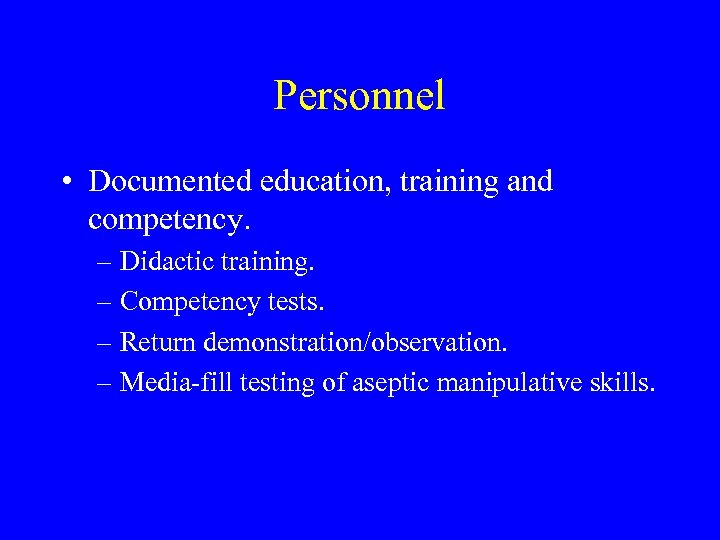 Personnel • Documented education, training and competency. – Didactic training. – Competency tests. – Return demonstration/observation. – Media-fill testing of aseptic manipulative skills.