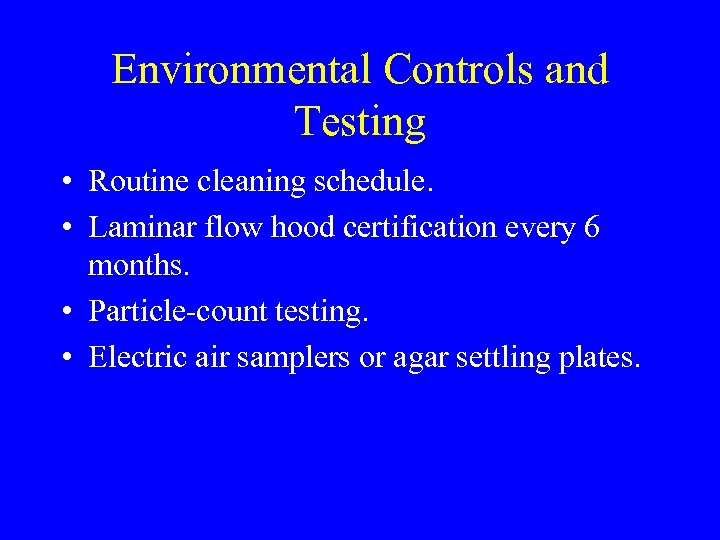 Environmental Controls and Testing • Routine cleaning schedule. • Laminar flow hood certification every 6 months. • Particle-count testing. • Electric air samplers or agar settling plates.