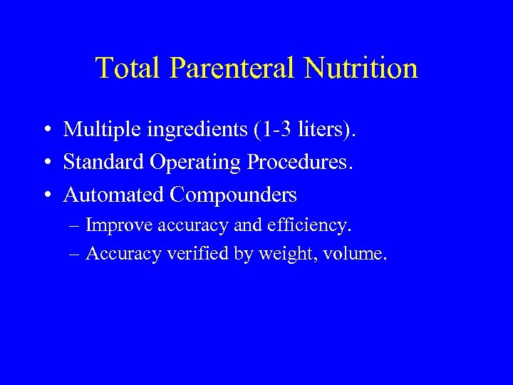 Total Parenteral Nutrition • Multiple ingredients (1 -3 liters). • Standard Operating Procedures. • Automated Compounders – Improve accuracy and efficiency. – Accuracy verified by weight, volume.
