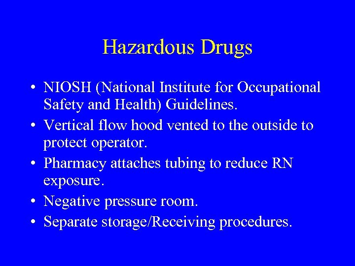 Hazardous Drugs • NIOSH (National Institute for Occupational Safety and Health) Guidelines. • Vertical flow hood vented to the outside to protect operator. • Pharmacy attaches tubing to reduce RN exposure. • Negative pressure room. • Separate storage/Receiving procedures.