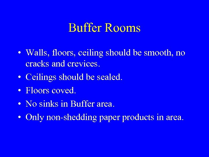 Buffer Rooms • Walls, floors, ceiling should be smooth, no cracks and crevices. • Ceilings should be sealed. • Floors coved. • No sinks in Buffer area. • Only non-shedding paper products in area.