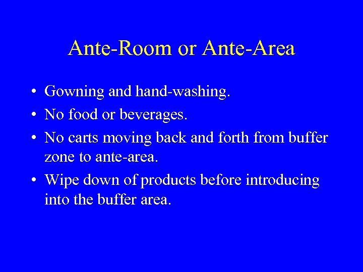 Ante-Room or Ante-Area • Gowning and hand-washing. • No food or beverages. • No carts moving back and forth from buffer zone to ante-area. • Wipe down of products before introducing into the buffer area.