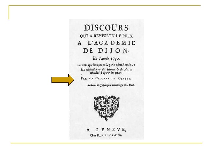 First Discourse: Discourse on the Sciences and the Arts n n ‘All my little passions were stifled by an enthusiasm for truth, liberty, and virtue…this fermentation worked in my heart for more than four years…’ (Confs. , Bk 8, p. 328). ‘The work, however, though full of strength and fervour, is completely lacking in logic and order’ (pp. 328 -9).