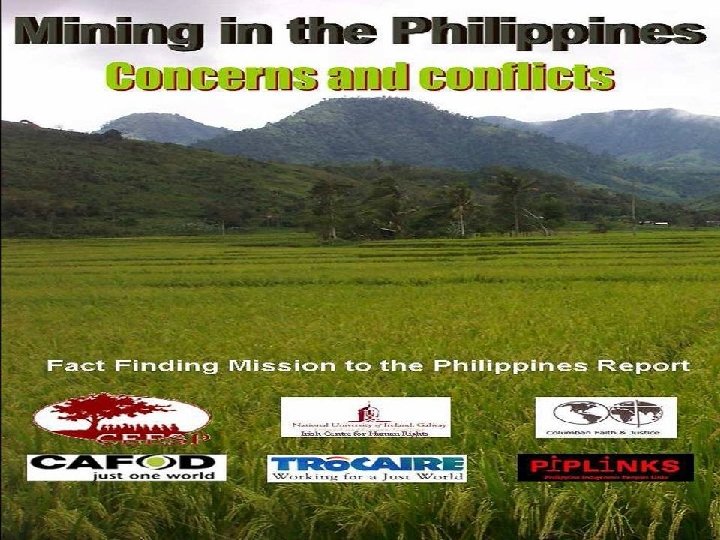 Human Rights: Context • Extrajudicial Killings: since 2001 estimated at over 800 – At least 11 of these associated with mining. • Corruption: Transparency International described the Philippines in 2004 as suffering from ‘rampant corruption’. – According to a 2005 EC report on the Philippines corruption has been ‘traditionally notorious’ w. r. t. mining concessions • Indigenous peoples: Over 10 million in the Philippines – Mostly living in the uplands due to generations of settlers and logging activities encroaching on their lands – Overlap with areas where mineral deposits are located • 16 of 24 Priority Mining projects are on indigenous lands – Mining poses a threat to their survival as peoples