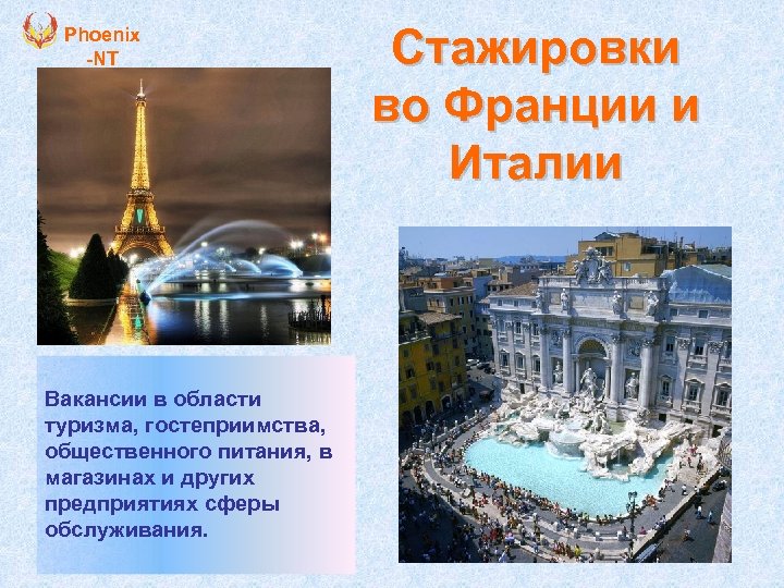 Phoenix -NT Вакансии в области туризма, гостеприимства, общественного питания, в магазинах и других предприятиях сферы обслуживания. Стажировки во Франции и Италии