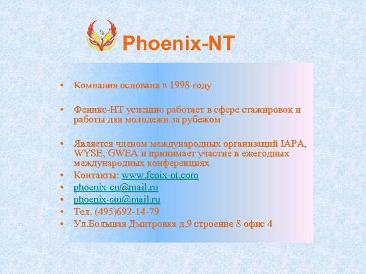 Phoenix-NT • Компания основана в 1998 году • Феникс-НТ успешно работает в сфере стажировок и работы для молодежи за рубежом • Является членом международных организаций IAPA, WYSE, GWEA и принимает участие в ежегодных международных конференциях • Контакты: www. fenix-nt. com • phoenix-cn@mail. ru • phoenix-stu@mail. ru • Тел. (495)692 -14 -79 • Ул. Большая Дмитровка д. 9 строение 8 офис 4