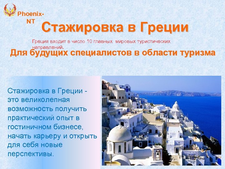 Phoenix. NT Стажировка в Греции Греция входит в число 10 главных мировых туристических направлений. Для будущих специалистов в области туризма Стажировка в Греции это великолепная возможность получить практический опыт в гостиничном бизнесе, начать карьеру и открыть для себя новые перспективы.