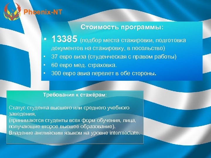 Phoenix-NT Стоимость программы: • 13385 (подбор места стажировки, подготовка • • • документов на стажировку, в посольство) 37 евро виза (студенческая с правом работы) 60 евро мед. страховка. 300 евро авиа перелет в обе стороны. Требования к стажёрам: Статус студента высшего или среднего учебного заведения, (принимаются студенты всех форм обучения, лица, получающие второе высшее образование). Владение английским языком на уровне intermediate.