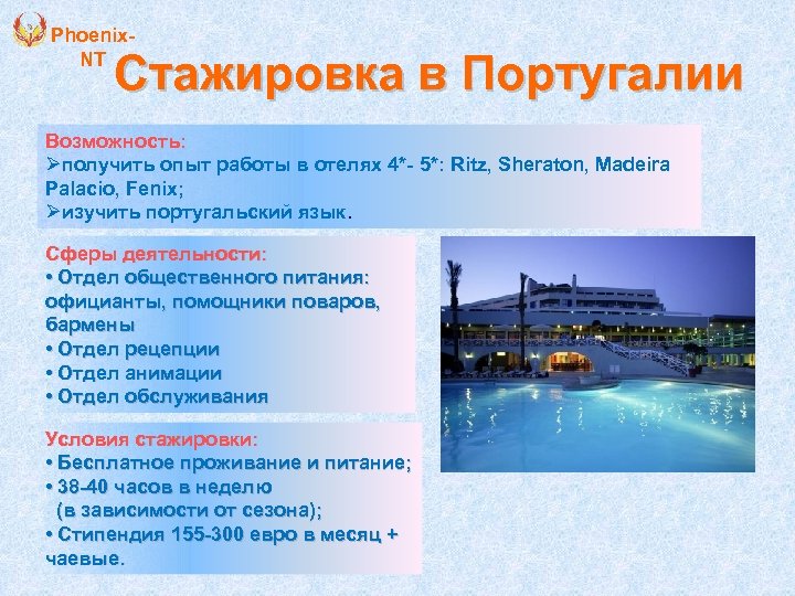 Phoenix. NT Стажировка в Португалии Возможность: Øполучить опыт работы в отелях 4*- 5*: Ritz, Sheraton, Madeira Palacio, Fenix; Øизучить португальский язык. Сферы деятельности: • Отдел общественного питания: официанты, помощники поваров, бармены • Отдел рецепции • Отдел анимации • Отдел обслуживания Условия стажировки: • Бесплатное проживание и питание; • 38 -40 часов в неделю (в зависимости от сезона); • Стипендия 155 -300 евро в месяц + чаевые.