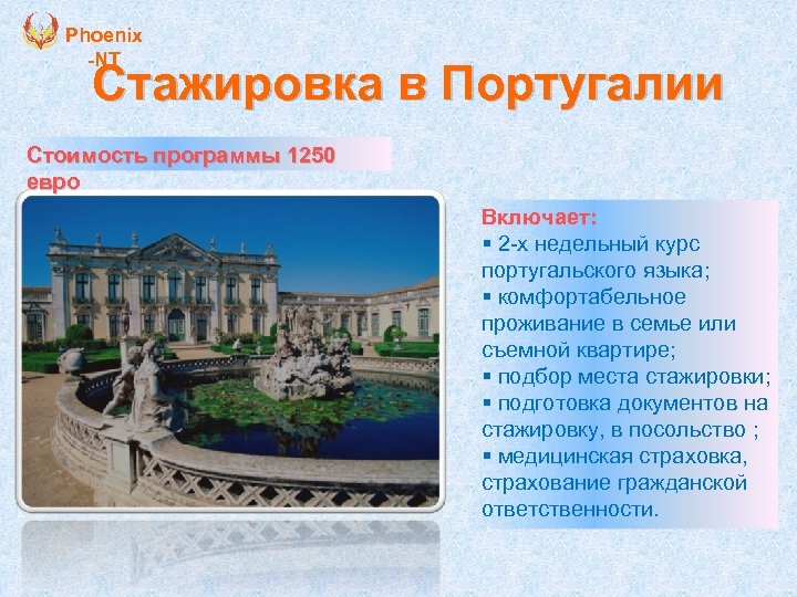 Phoenix -NT Стажировка в Португалии Стоимость программы 1250 евро Включает: § 2 -х недельный курс португальского языка; § комфортабельное проживание в семье или съемной квартире; § подбор места стажировки; § подготовка документов на стажировку, в посольство ; § медицинская страховка, страхование гражданской ответственности.