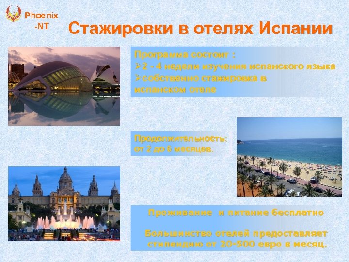 Phoenix -NT Стажировки в отелях Испании Программа состоит : Ø 2 - 4 недели изучения испанского языка Øсобственно стажировка в испанском отеле Продолжительность: от 2 до 6 месяцев. Проживание и питание бесплатно Большинство отелей предоставляет стипендию от 20 -500 евро в месяц.