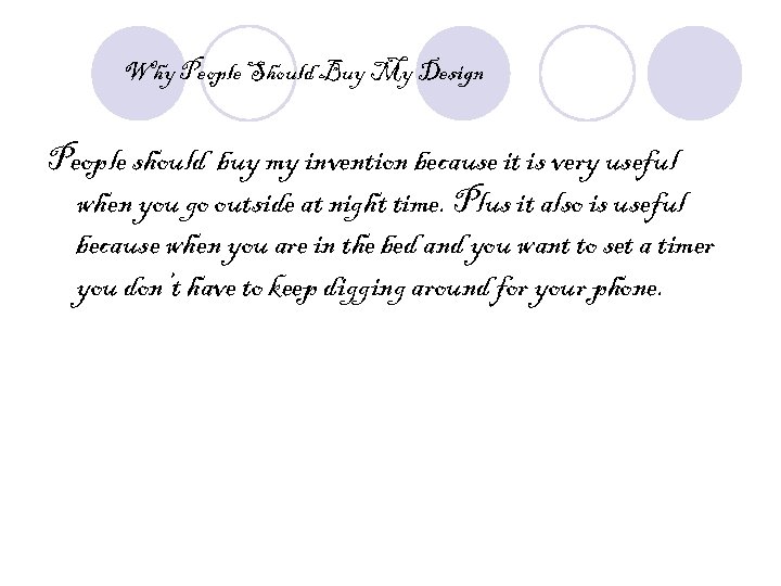 Why People Should Buy My Design People should buy my invention because it is very useful when you go outside at night time. Plus it also is useful because when you are in the bed and you want to set a timer you don’t have to keep digging around for your phone.