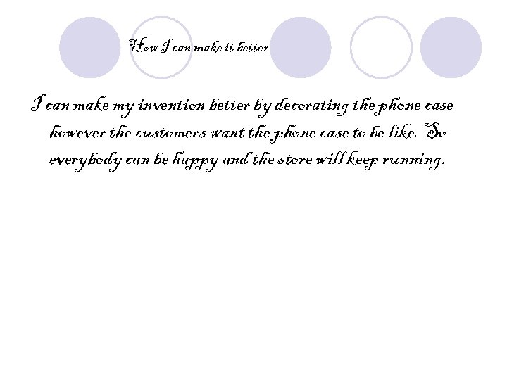 How I can make it better I can make my invention better by decorating the phone case however the customers want the phone case to be like. So everybody can be happy and the store will keep running.
