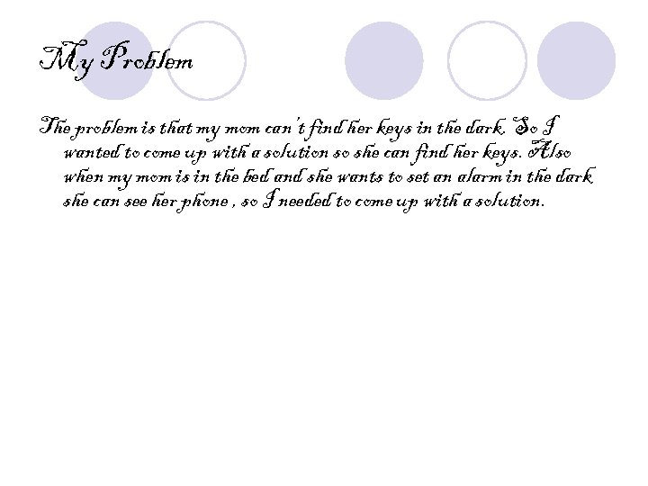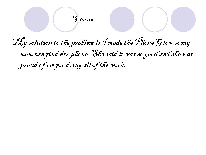 Solution My solution to the problem is I made the Phone Glow so my mom can find her phone. She said it was so good and she was proud of me for doing all of the work.