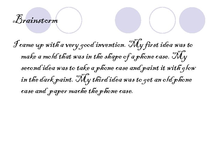 Brainstorm I came up with a very good invention. My first idea was to make a mold that was in the shape of a phone case. My second idea was to take a phone case and paint it with glow in the dark paint. My third idea was to get an old phone case and paper mache the phone case.