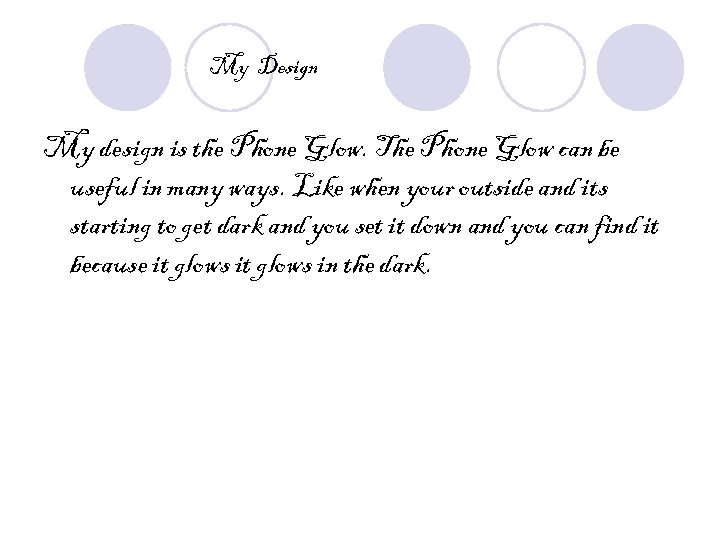 My Design My design is the Phone Glow. The Phone Glow can be useful in many ways. Like when your outside and its starting to get dark and you set it down and you can find it because it glows in the dark.