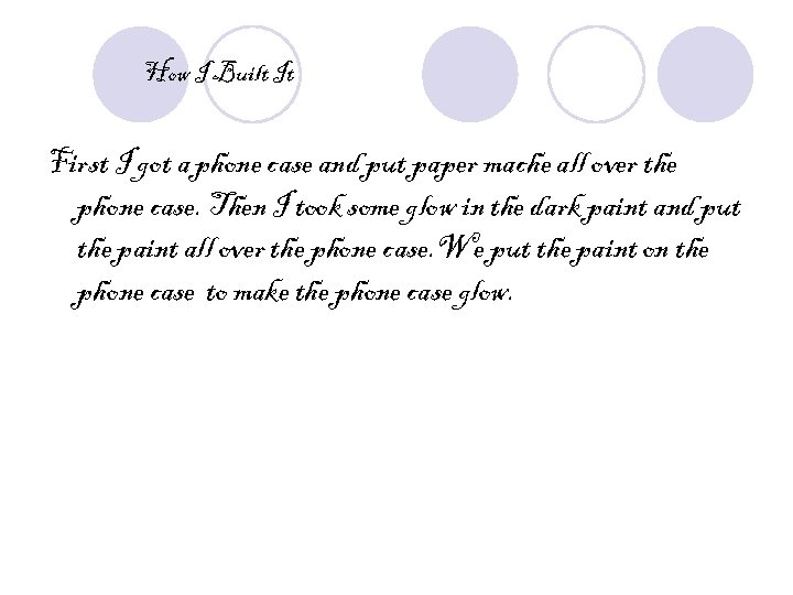 How I Built It First I got a phone case and put paper mache all over the phone case. Then I took some glow in the dark paint and put the paint all over the phone case. We put the paint on the phone case to make the phone case glow.