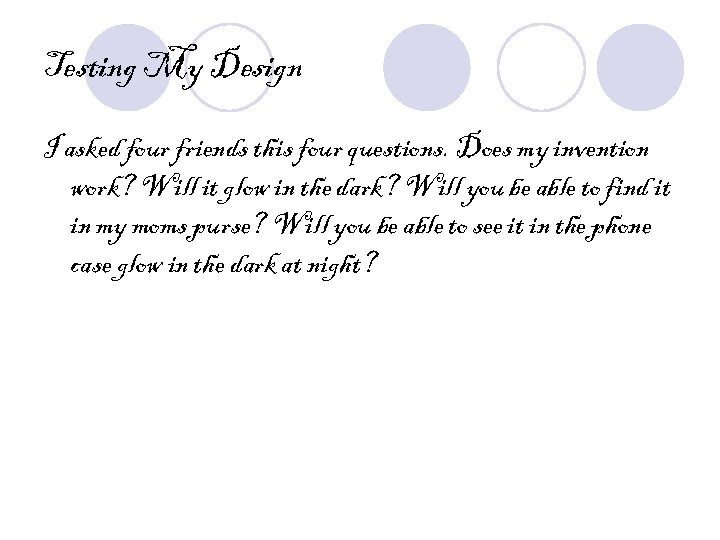 Testing My Design I asked four friends this four questions. Does my invention work? Will it glow in the dark? Will you be able to find it in my moms purse? Will you be able to see it in the phone case glow in the dark at night?