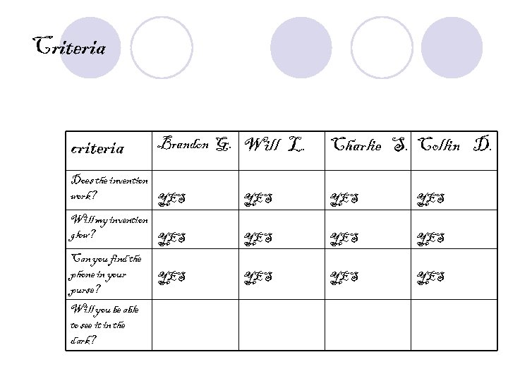 Criteria criteria Brandon G. Will L. Charlie S. Collin D. Does the invention work? YES YES Will my invention glow? YES YES Can you find the phone in your purse? Will you be able to see it in the dark? YES