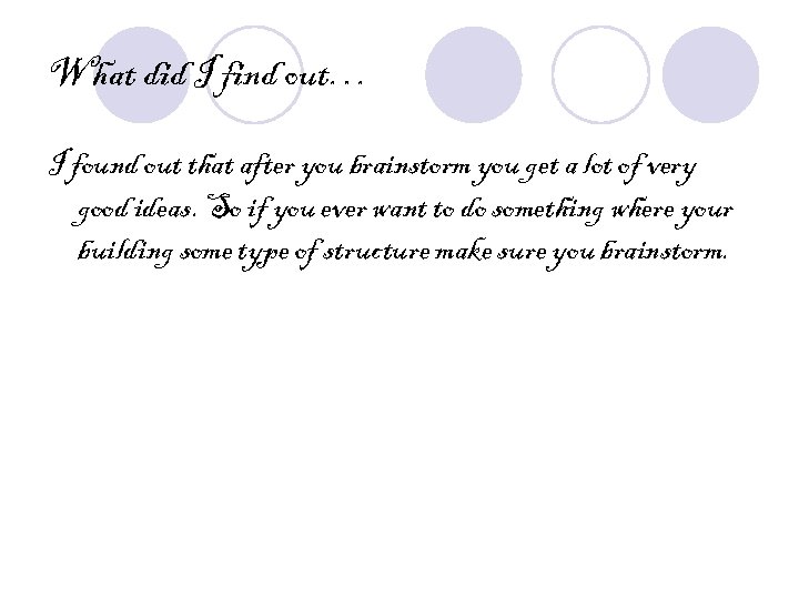 What did I find out… I found out that after you brainstorm you get a lot of very good ideas. So if you ever want to do something where your building some type of structure make sure you brainstorm.