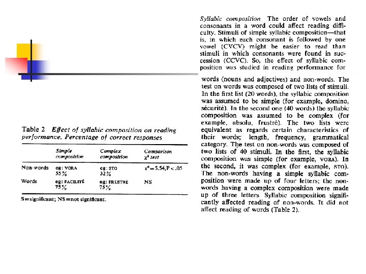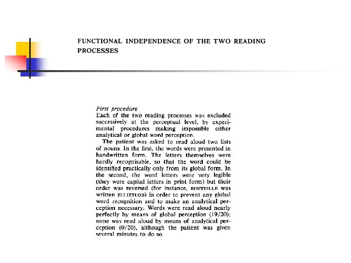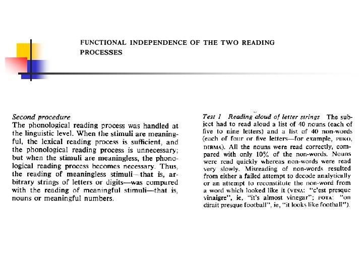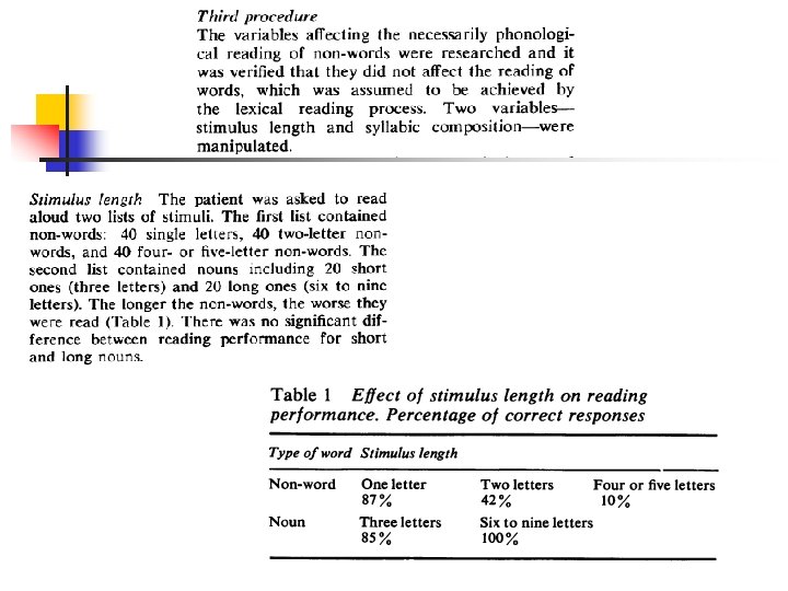 The theoretical interpretation of phonological dyslexia n It is obvious that phonological dyslexia can be interpreted as due to a specific impairment of the non-lexical reading route of the model - the route that goes from abstract letter identification through letter-to-sound rules to phonological output buffer. Damage at any stage along that route will impair the ability to read nonwords. Even when there is such damage, word reading will still be possible, because the lexical reading route can still be used.