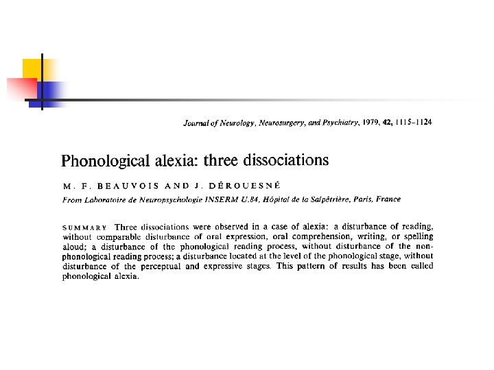 Phonological dyslexia n n n Introduction Phonological dyslexia was first described by Beauvois and Derouesne (1979); other early case are in Shallice and Warrington (1980), Patterson (1982) and Funnell (1983). A number of other studies of phonological dyslexia have appeared since then, and one issue of the journal Cognitive Neuropsychology in 1996 is a Special Issue devoted entirely to this particular acquired dyslexia. Phonological dyslexia also occurs as a form of developmental dyslexia i. e. as a specific pattern of difficulty in learning to read, in children without any sign of neurological abnormality.