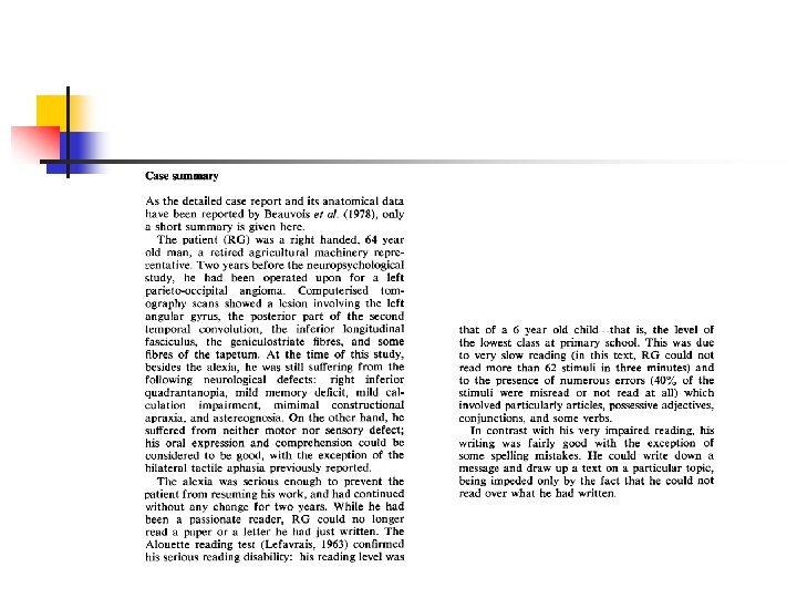 References n Beauvois, M. F. , & and Derouesne, J. (1979) Phonological alexia: three dissociations. Journal of Neurology, Neurosurgery and Psychiatry, 42, 1115 -1124. n Castles, A. and Coltheart, M. Varieties of developmental dyslexia. Cognition, 1993, 47, 149 -180. n Coltheart, M. Varieties of developmental dyslexia. Cognition, 1987, 27, 97 -101. n n n Coltheart, M. (Ed. ), Phonological Dyslexia. Hove: Lawrence Erlbaum Associates, 1996. A special issue of the jourrnal Cognitive Neuropsychology (1996, September). Coltheart, M. (1985) Cognitive neuropsychology and the study of reading. In Posner, M. I and Marin, O. S. M (Eds) Attention and Performance XI. London: Lawrence Erlbaum Associates. Funnell, E. (1983) Phonological processes in reading: New evidence from acquired dyslexia. British Journal of Psychology, 74, 159 -180. Patterson, K. (1982) The relation between reading and phonological coding: Further neuropsychological observations. In Ellis, A. W. (Ed), Normality and Pathology in Cognitive Functions. London: Academic Press. Shallice, T. and Warrington, E. K. (1980) Single and multiple component central dyslexic syndromes. In Coltheart, M. , Patterson, K. , and Marshall, J. C. (Eds. ), Deep Dyslexia. London: Routledge and Kegan Paul Temple, C. M. , & Marshall, J. C. (1983). A case study of developmental phonological dyslexia. British Journal of Psychology, 74, 517 -533.