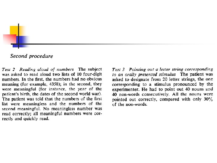 The symptoms of phonological dyslexia. n n This is not really a problem for the cognitive neuropsychology of reading, which does not attempt to categorize patients into syndromes. And it is not really a problem for the clinician, since when a patient is observed with a selective difficulty in nonword reading, then * If semantic errors in word reading are present, and nonword reading is zero, call the patient a deep dyslexic; * If there are no semantic errors in word reading, and nonword reading is impaired but is not at zero, call the patient a phonological dyslexic. * Lastly, if semantic errors in word reading are present but nonword reading is not at zero, or if there are no semantic errors in word reading but nonword reading is at zero, call me - both of these patterns are important and need research!