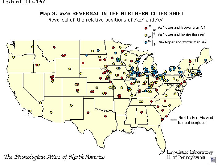 Ongoing changes in American English pronunciation 1. Loss of difference between AA (cot) and AO (caught). See also hot dog (h AA t d AO g). Some speakers produce these vowels differently (I do). Others do not. Labov’s group has produced the following map:
