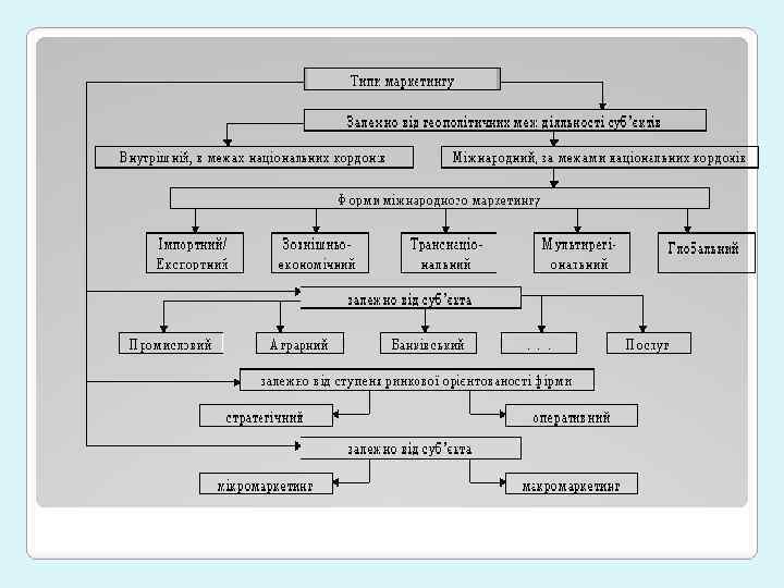 В основі поняття «маркетинг» (англ. marketing) лежить термін «ринок» . Це поняття в найбільш загальному виді припускає ринкову діяльність. Під маркетингом розуміється такий вид ринкової діяльності, при якому виробником використовується системний підхід і програмно -цільовий метод вирішення господарських проблем, а ринок, його вимоги і характер реакції є критерієм ефективності діяльності.