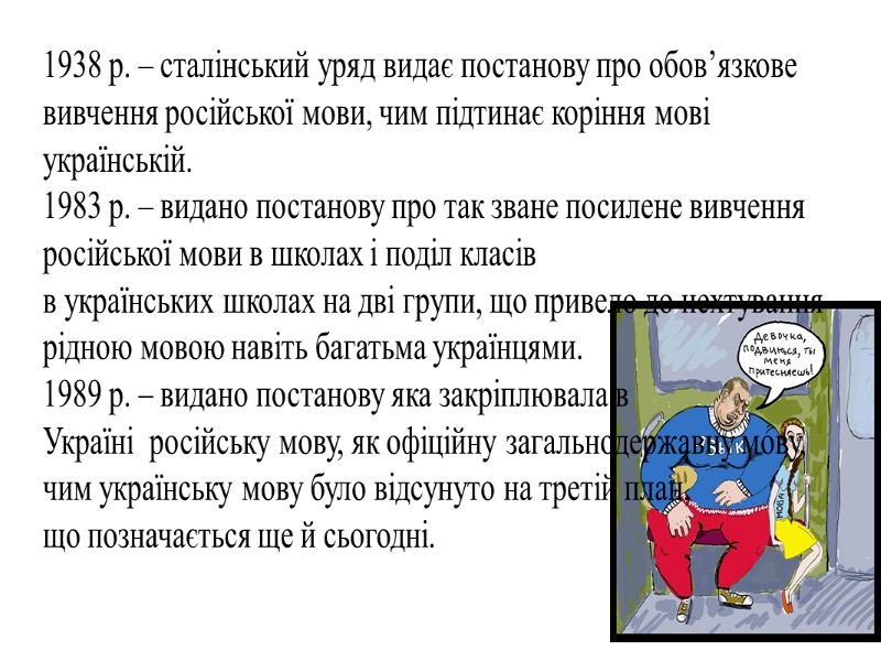 1938 р. – сталінський уряд видає постанову про обов’язкове вивчення російської мови, чим підтинає коріння мові українській. 1983 р. – видано постанову про так зване посилене вивчення російської мови в школах і поділ класів в українських школах на дві групи, що привело до нехтування рідною мовою навіть багатьма українцями. 1989 р. – видано постанову яка закріплювала в Україні російську мову, як офіційну загальнодержавну мову, чим українську мову було відсунуто на третій план, що позначається ще й сьогодні.